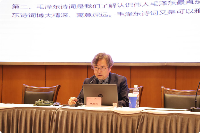 讲座伊始,钱佐扬教授以“毛泽东诗词是毛泽东思想的重要组成部分”为切入点,系统阐述了毛泽东诗词在哲学思想、历史镜像与革命精神中的独特价值。指出,毛泽东诗词不仅是中国人民的精神财富,更是研究中国近现代历史的重要窗口。通过《沁园春·雪》《七律·长征》《忆秦娥·娄山关》等经典作品,钱教授生动解析了诗词中蕴含的豪迈气概、家国情怀与革命乐观主义精神,并强调这些作品“雅俗共赏”,既展现了毛泽东作为领袖的雄才大略,也流露出他作为普通人的真挚情感。