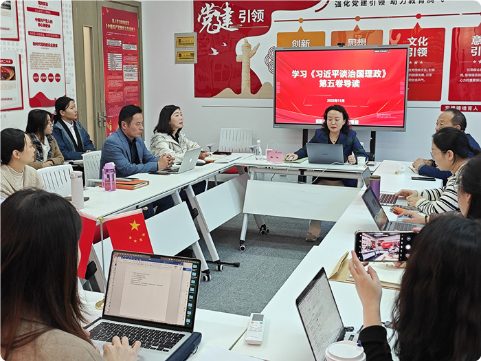2025年11月13日下午,上海思博职业技术学院党委副书记、副校长张辉来到人文与教育学院,开展《习近平谈治国理政》第五卷专题领学活动。学院党支部书记、院长张金福,支部副书记卢小希带领学院全体党员教师及学生代表共同参加学习。