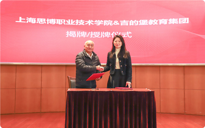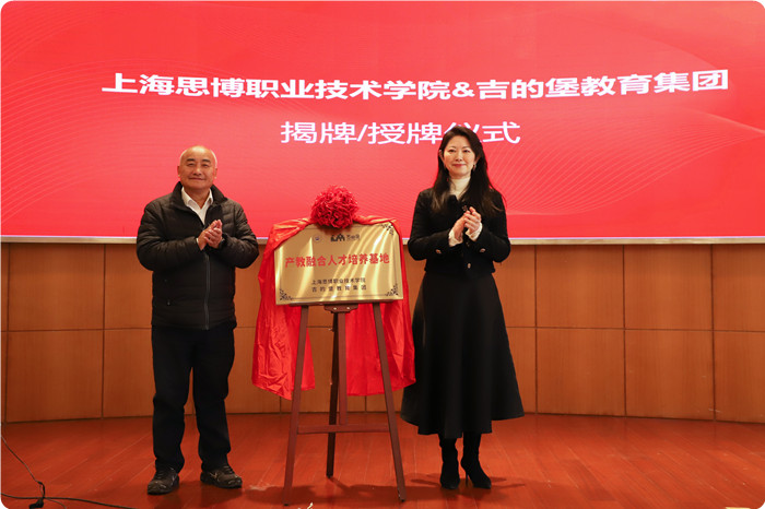 在与会嘉宾的共同见证下,黄正校长与龚宸谊总经理代表双方签署了校企合作协议。随后,双方共同为“上海思博职业技术学院&吉的堡教育集团产教融合人才培养基地”揭牌,吉的堡教育集团区域总督导、人才育成中心负责人姜冠群为上海思博职业技术学院吉德堡教育集团专项班授牌。